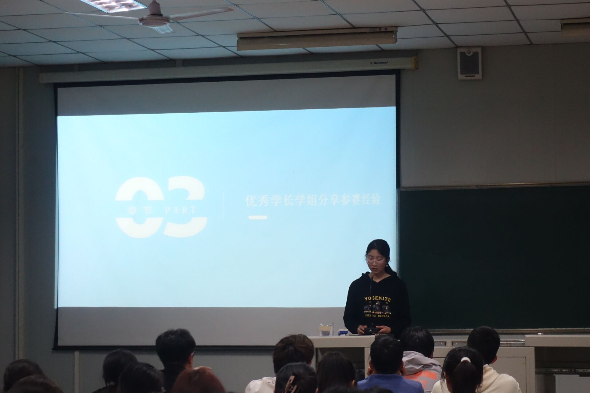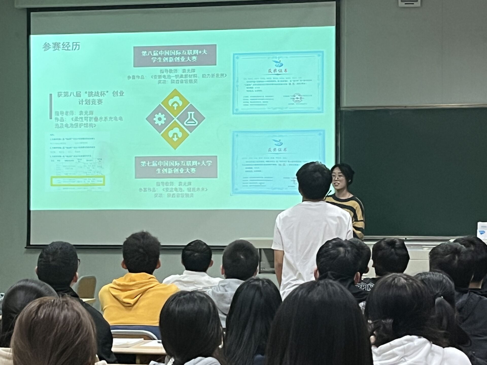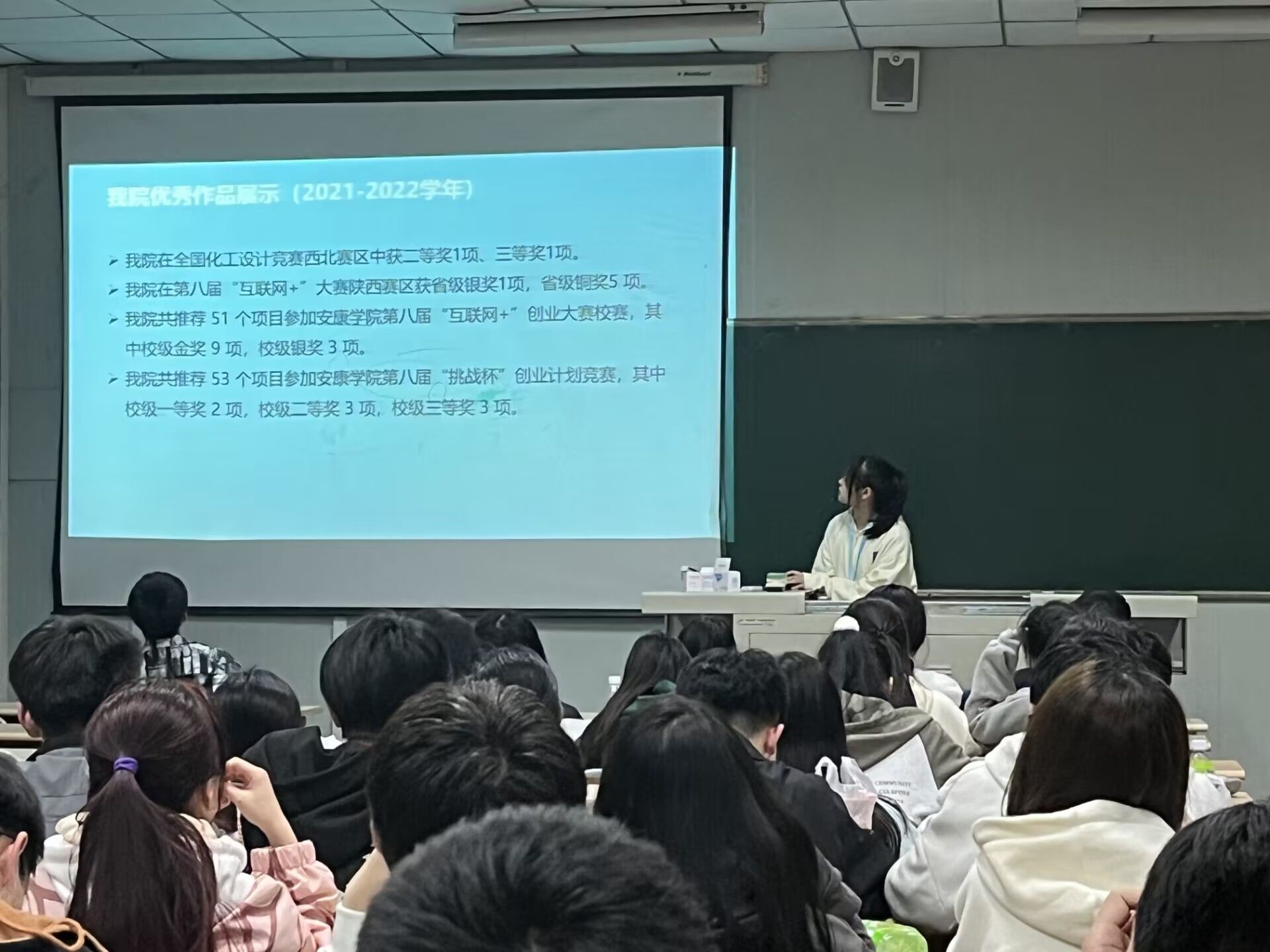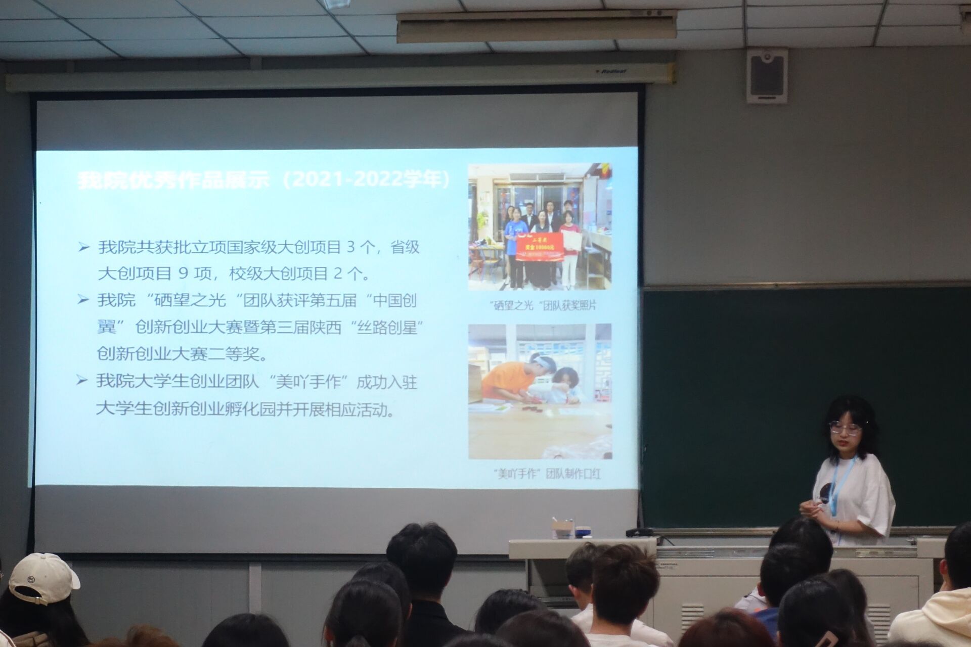 其次,向同学们重点展示了公司员工在2021-2022学年创新创业大赛中所取得的成绩,并邀请优秀参赛选手进行分享,从参赛经历,失败案例,参赛重点及步骤等方面引导同学们对创新创业大赛深入思考。