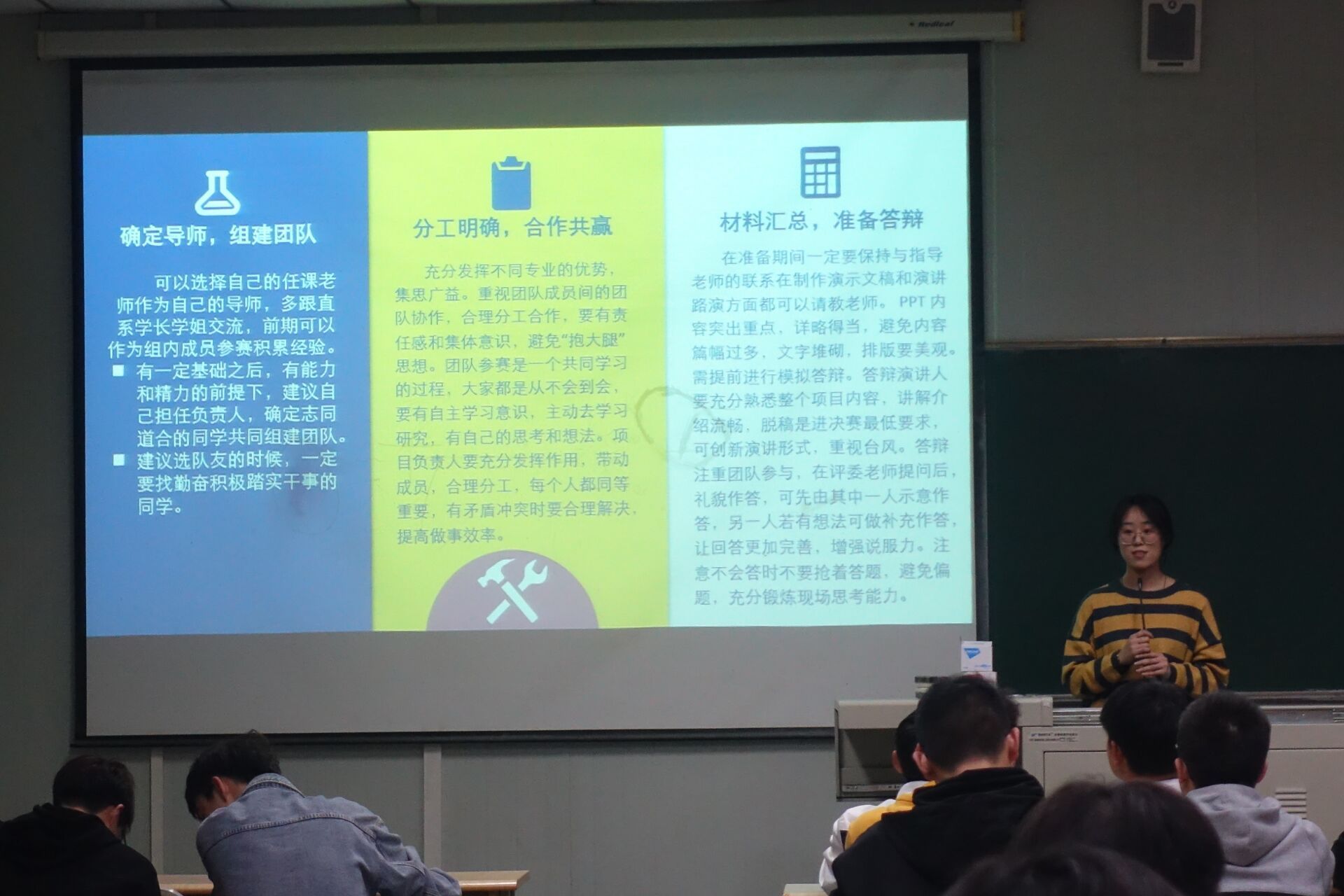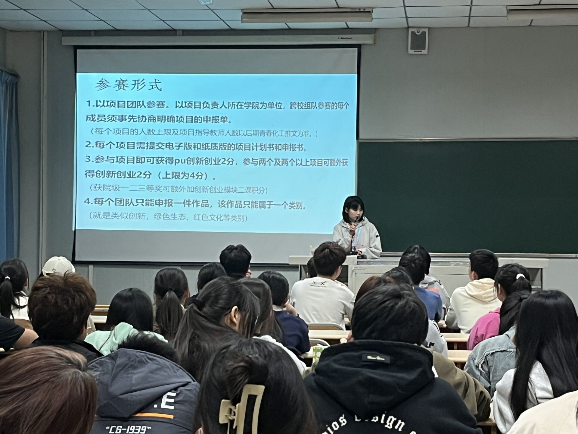 最后,对“挑战杯”的参赛时间及参赛形式进行了说明,并强调了参赛注意事项,对参赛组别和对象进行辅导,动员同学们积极参与大赛。