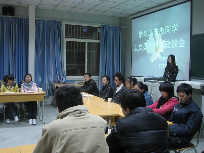 2011年12月13日晚7:00,我系在1018教室召开“学习冯浩杰同学见义勇为精神”座谈会,出席本次座谈会的有化学化工系党总支书记张立虎老师,学工办主任韩晔老师,辅导员张建东老师,以及农生院员工代表,我系员工会成员、员工代表100余人。