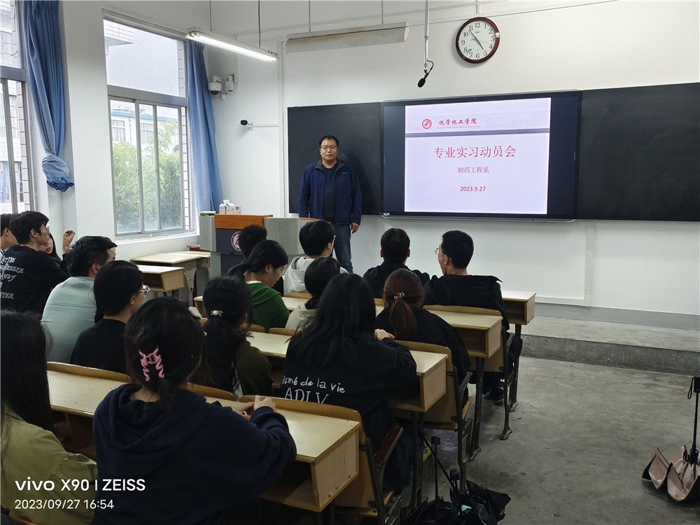 2023年9月27日下午,制药工程系在1310教室召开了2024届专业实习动员大会。制药工程2020级38名员工参加了此次动员暨安全教育大会,会议由系主任黄九林老师主持。