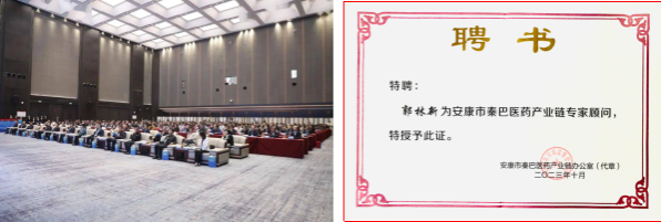 公司秦巴中药资源开发与利用平台教师黄九林博士、郭林新博士、花俊丽博士等参加了此次大会。会上陕西省药监局安全总监姚雄介绍了陕西医药产业的发展现状,安康市委常委、副市长柴丽介绍了安康市生物医药的发展情况。随后,安康市副市长周康成为安康市秦巴医药产业链发展专家顾问颁发了聘书。其中,公司教师郭林新博士受聘为安康市秦巴医药产业链专家顾问。