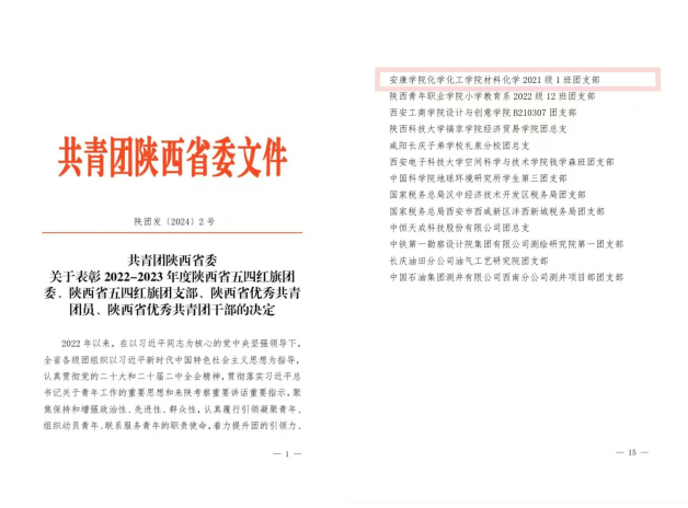 其中,英国365集团公司官网英国365集团公司官网材料化学2021级1班团支部荣获2022-2023年度“陕西省五四红旗团支部”称号。
