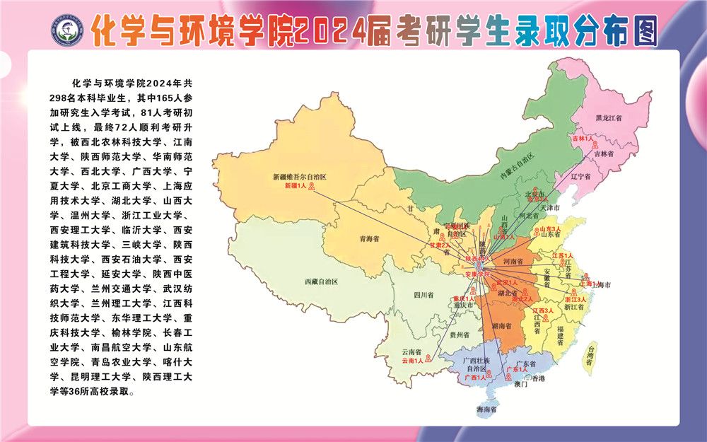 英国365集团公司官网2024年共298名本科毕业生,其中165人参加研究生入学考试,81人考研初试上线,最终72人顺利考研升学,被西北农林科技大学、江南大学、陕西师范大学、华南师范大学、西北大学、广西大学、宁夏大学、北京工商大学、上海应用技术大学、湖北大学、山西大学、温州大学、浙江工业大学、西安理工大学、临沂大学、西安建筑科技大学、三峡大学、陕西科技大学、西安石油大学、西安工程大学、延安大学、陕西中医药大学、兰州交通大学、武汉纺织大学、兰州理工大学、江西科技师范大学、东华理工大学、重庆科技大学、榆林公司、长春工业大学、南昌航空大学、山东航空公司、青岛农业大学、喀什大学、昆明理工大学、陕西理工大学等36所高校录取。