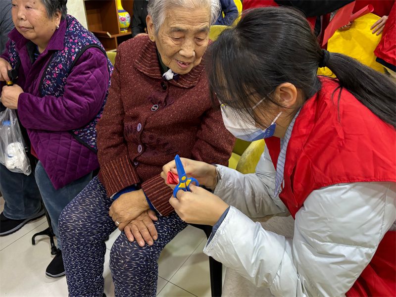 护理院内暖意融融,文艺表演环节更是将氛围推向高潮。激昂的《歌唱祖国》合唱,熟悉的旋律瞬间勾起老人们的青春记忆,不少老人轻声跟唱,有的还轻轻打着节拍。表演间隙,志愿者还与老人们共同开展“指尖传情”手工互动,手把手教老人折千纸鹤、串珠花,彩色的纸花在掌心绽放,也让温暖在彼此心间流淌。活动尾声,志愿者们为老人讲解秋冬季节的养生小知识。