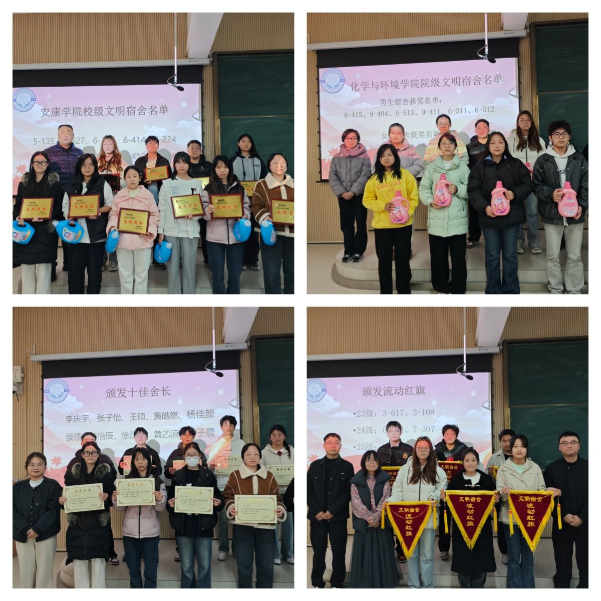 表彰环节,与会老师依次为第九届校级文明宿舍、院级文明宿舍、十佳舍长等获奖集体及个人颁发荣誉证书与奖品。